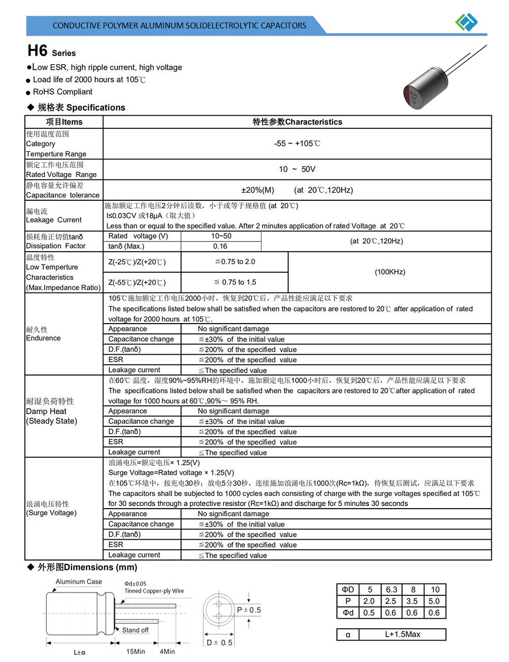 ● Low ESR, high ripple current, high voltage ● Load life of 2000 hours at 105℃ ● RoHS Compliant